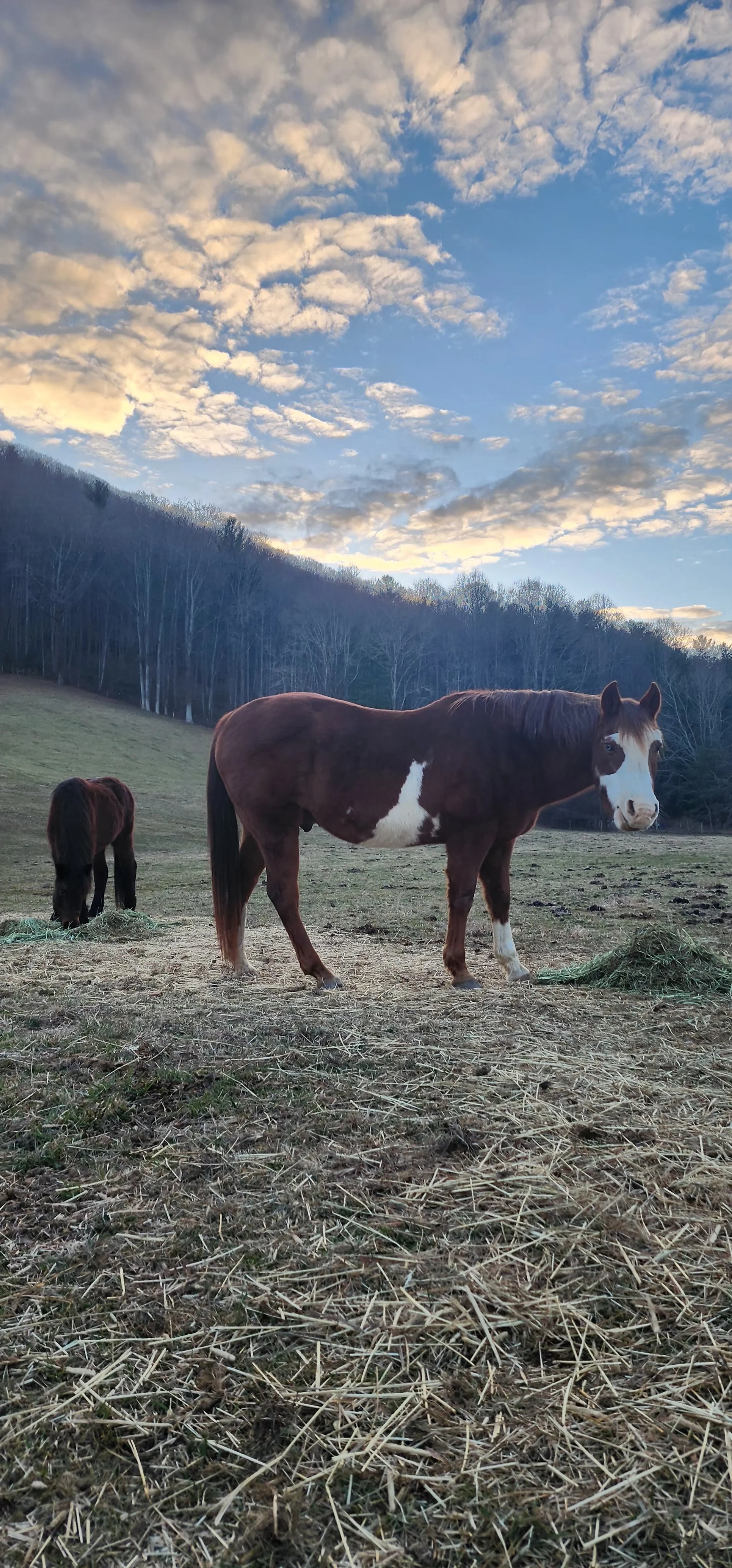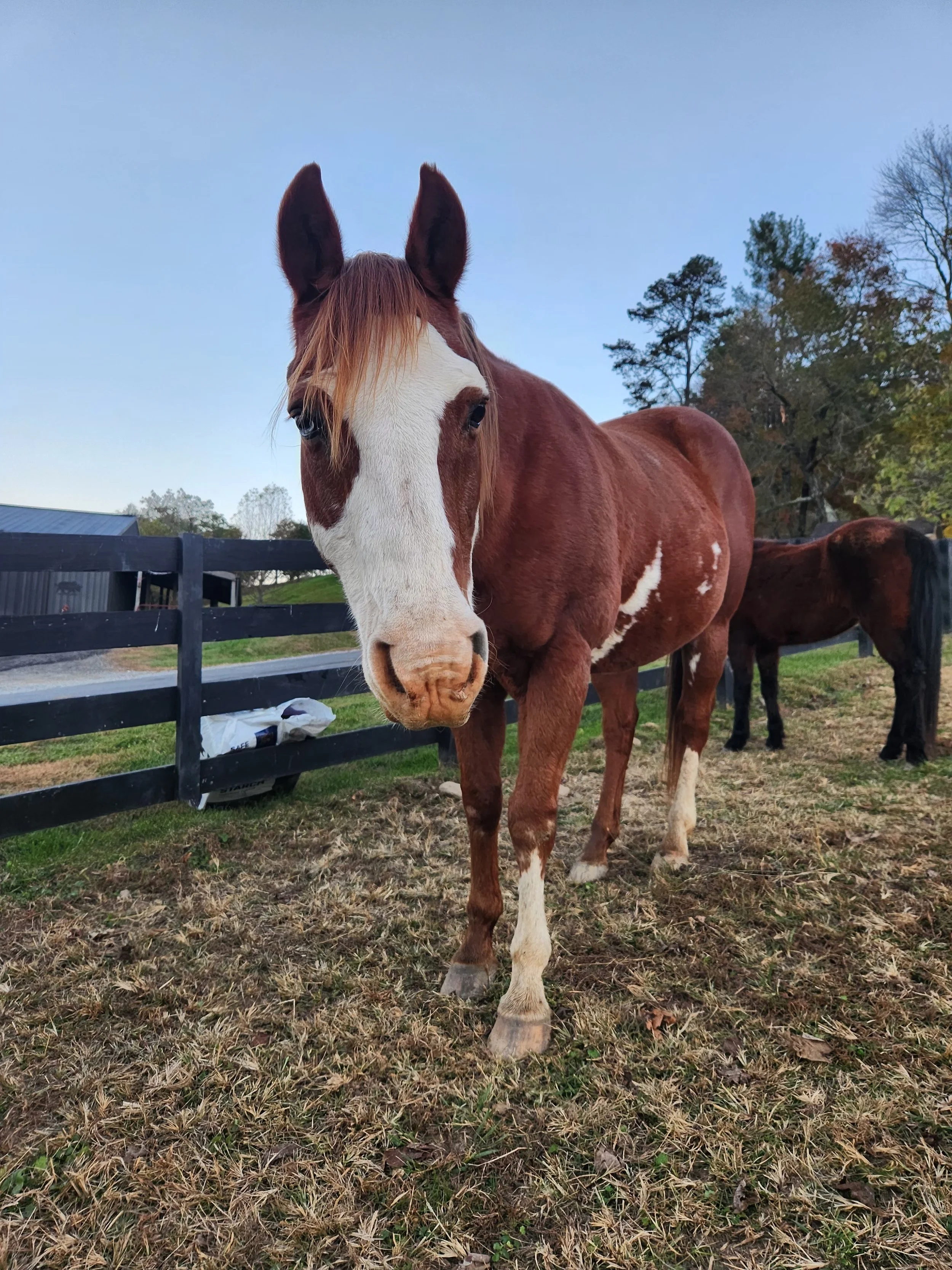 Meet Copper! This 14.2 hands tall, Chestnut, American Paint Horse is 26 years old and in need of a soft place to land. He is no longer ridable, but is a lovely pasture ornament and a good friend to his pony pal, Mimi!
